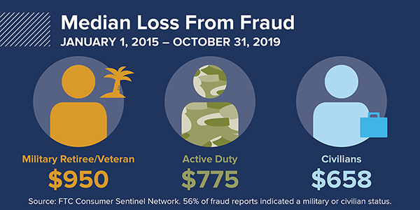 But here’s the thing: the median loss for military retirees and veterans is $950. Compare that to the median loss for active duty servicemembers ($775) and for civilians ($658).